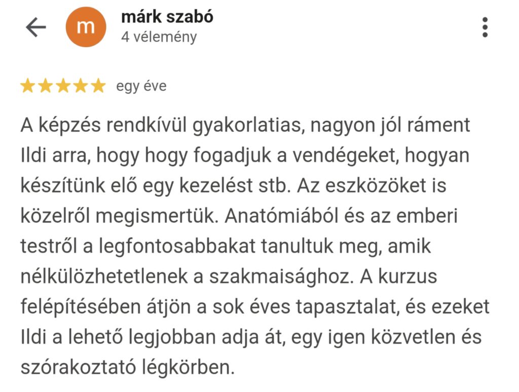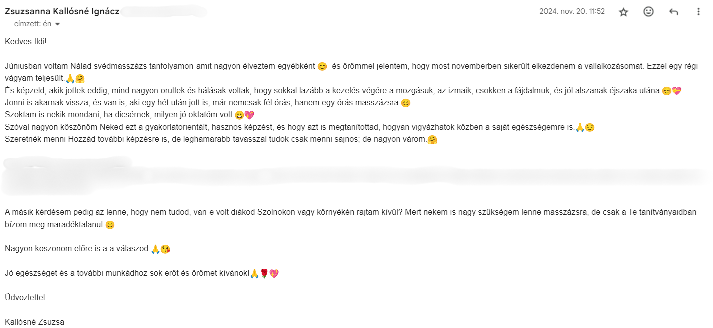 Az évek során olyan rendszert építettem fel, amelyben az anatómiai ismeretektől kezdve az ügyfélkommunikáción át egészen a vállalkozás menedzseléséig minden szükséges tudást megkapsz. Célom, hogy a masszőri hivatás ne csak egy szakma legyen számodra, hanem az az út, amely megadja azt a szabadságot, elismerést és anyagi biztonságot, amit a multis környezetben nem kaphattál meg.